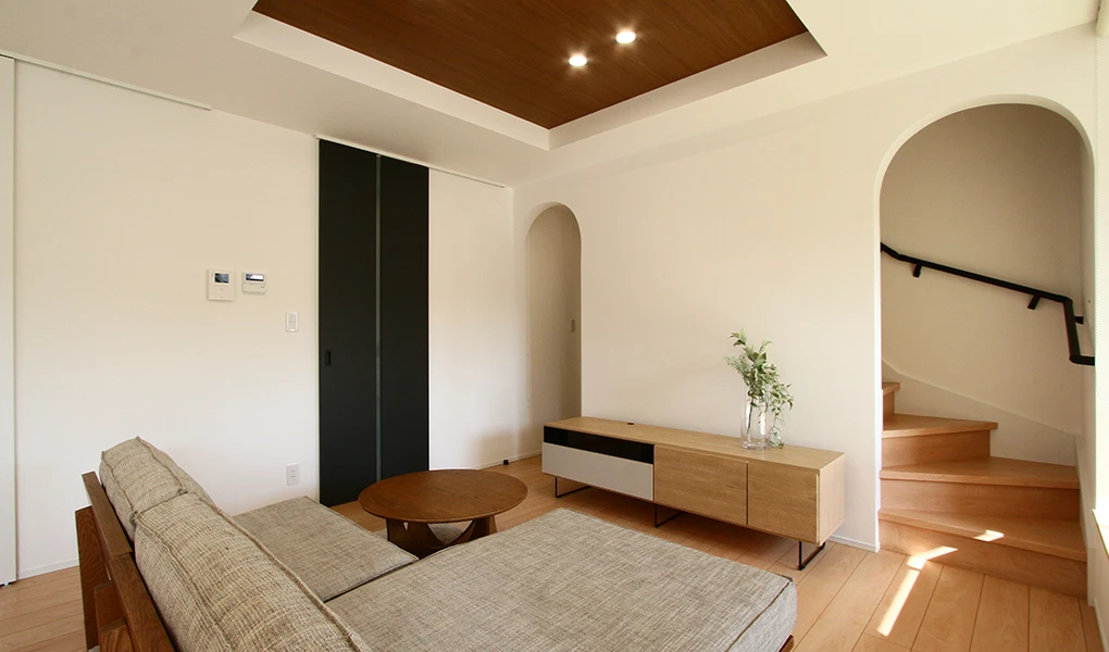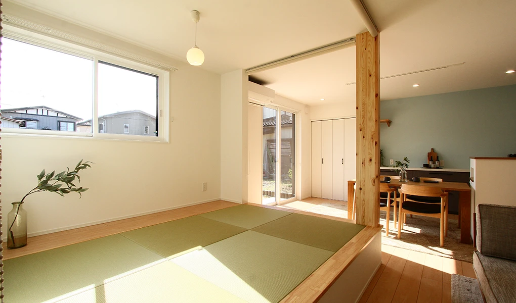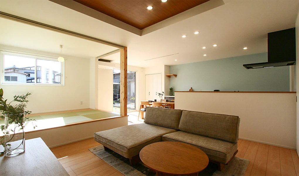 小上がり和室を含めて約23帖のLDKは、キッチンから全体が見渡せて広く感じられる間取り。ダイニングの隣にタイルテラスを設けたことで、BBQなどのアウトドアも手軽に楽しめるようになっています♪