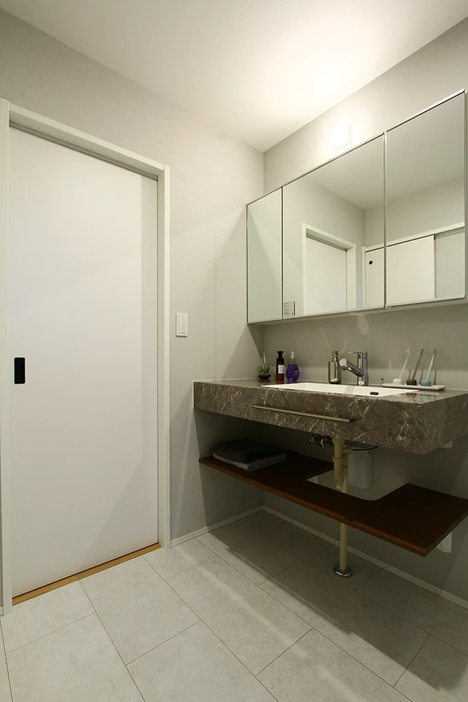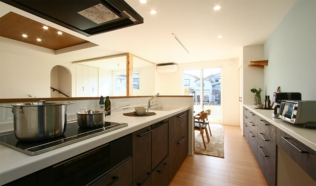 1階は廊下をなくし、LDKからそのまま水回りへ行ける回遊動線としました。おしゃれな造作洗面台や、短い洗濯動線などもポイントです。
