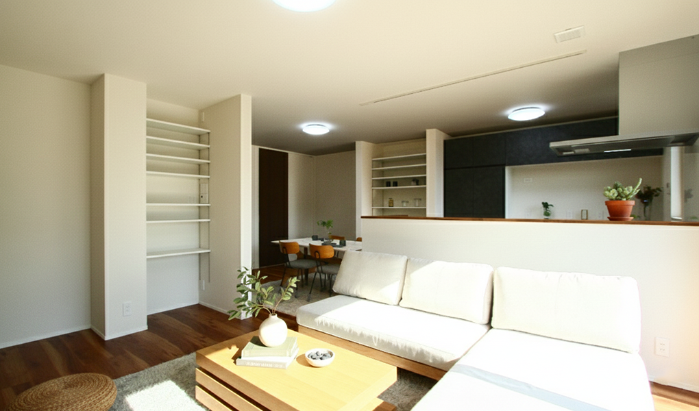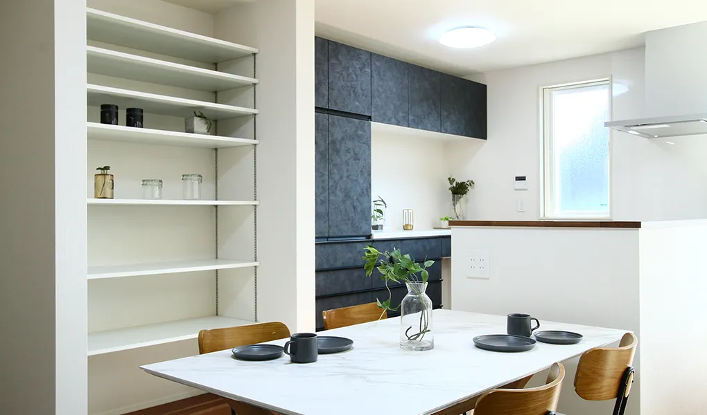 LDK内の収納は、ロールスクリーンで仕切れる仕様にすることで圧迫感を軽減。2階には納戸を2つ用意し、オフシーズンの家電や趣味の道具などもスッキリ片付けられる収納計画になっています◎