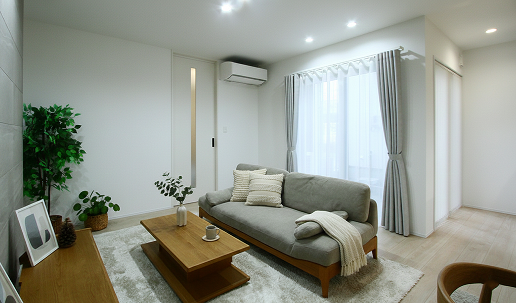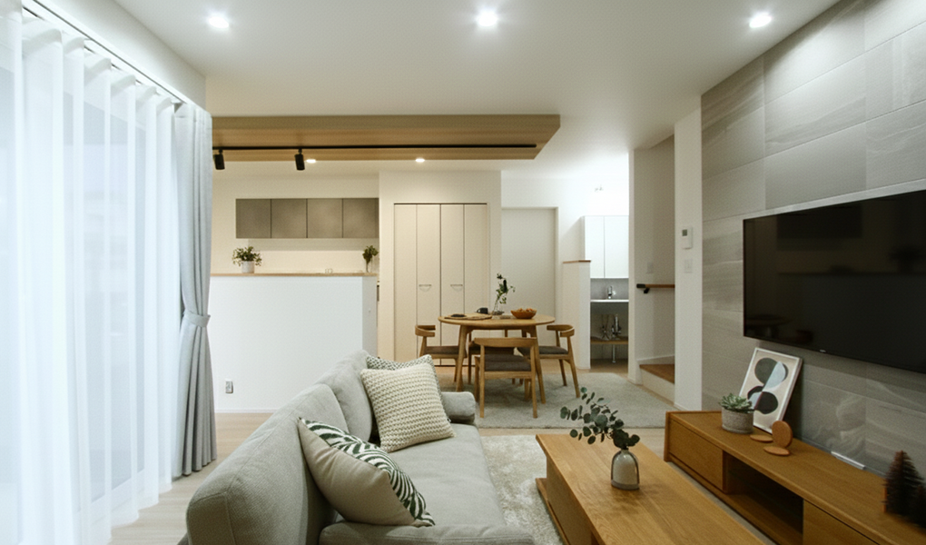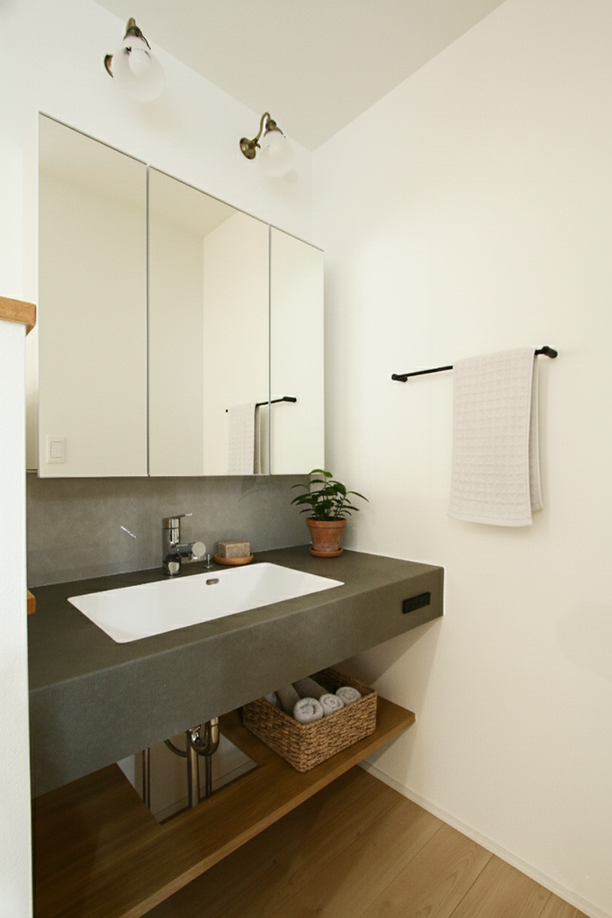 明るい木目を基調に、ホワイトとグレーでコーディネートしたナチュラルテイスト。LDK内に設けた幅広の造作洗面台も、空間に馴染むデザインに仕上げました。