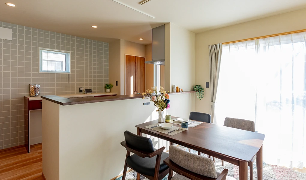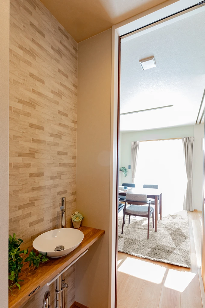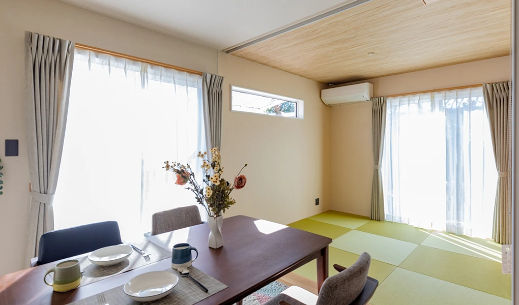 リアルな木目調の天井と、和紙調の壁で空間演出した畳リビングがポイントのLDK。外には土間テラスを設け、お庭でもくつろげるプランとしました。