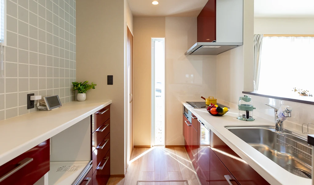 外観はクラシカルな白い玄関ドアを引き立てるため、玄関ポーチに赤みのある木目調を採用。内観は明るめのオーク柄をベースに、ワインブラウンのLDK建具やディープレッドのキッチンを組み合わせ、外観と連動するような赤みのアクセントを取り入れました。