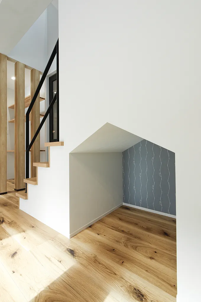 LDKの一角にはワークスペースを設け、お仕事やお子様の勉強スペースとしても活用できます。階段下を活用したヌックも必見です。