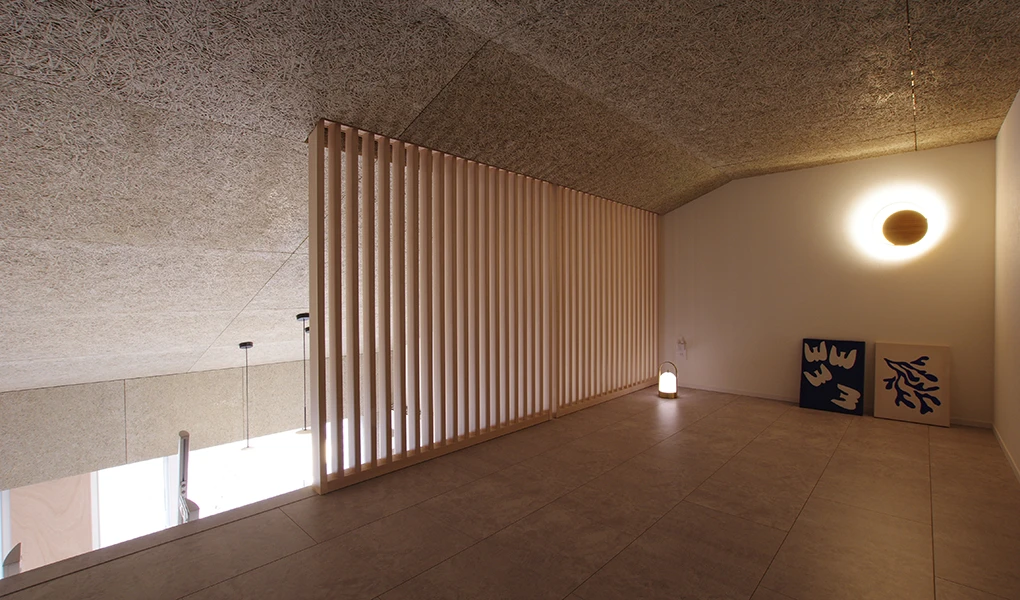 玄関からLDKまでオープンにつながる設計を活かしつつ、玄関の冷気をシャットダウンするためのレースカーテンをホールに設置。自然豊かな住環境に合わせて、自然素材の仕上げ材(ラワン合板・木毛セメント板・麻のカーテンなど)でコーディネートしているのもポイント。