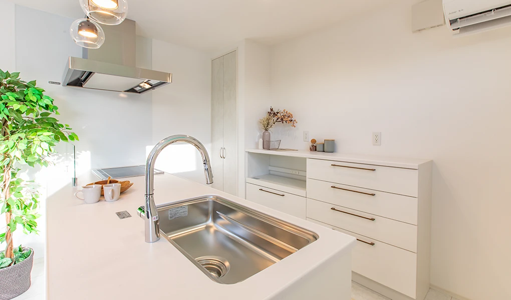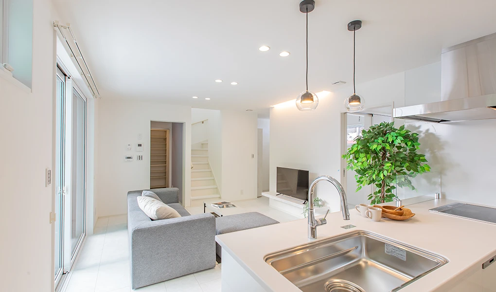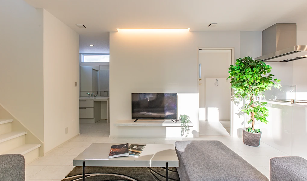 1階は床材にホワイトの石目調を採用してホテルライクに仕上げました。リビングのTV上に取り入れた間接照明もポイントです。