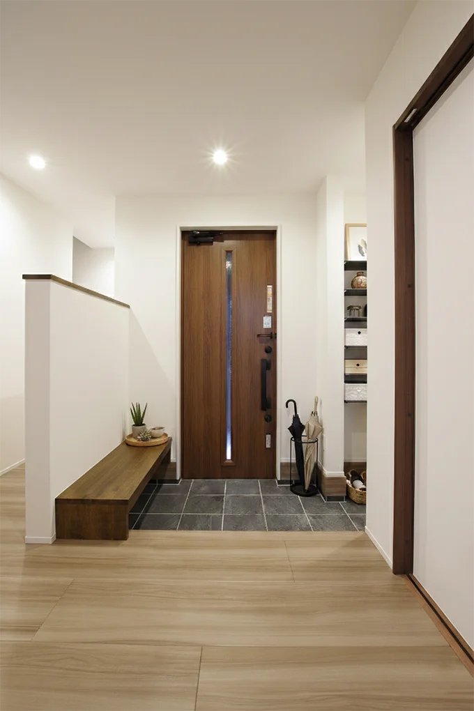 玄関は家の中が周囲から見えにくい横向きとしつつ、ホールを広めに確保したことでドアを開けてすぐに開放感を感じられる空間に。さらに将来も使いやすいよう、玄関ベンチを造作しました◎