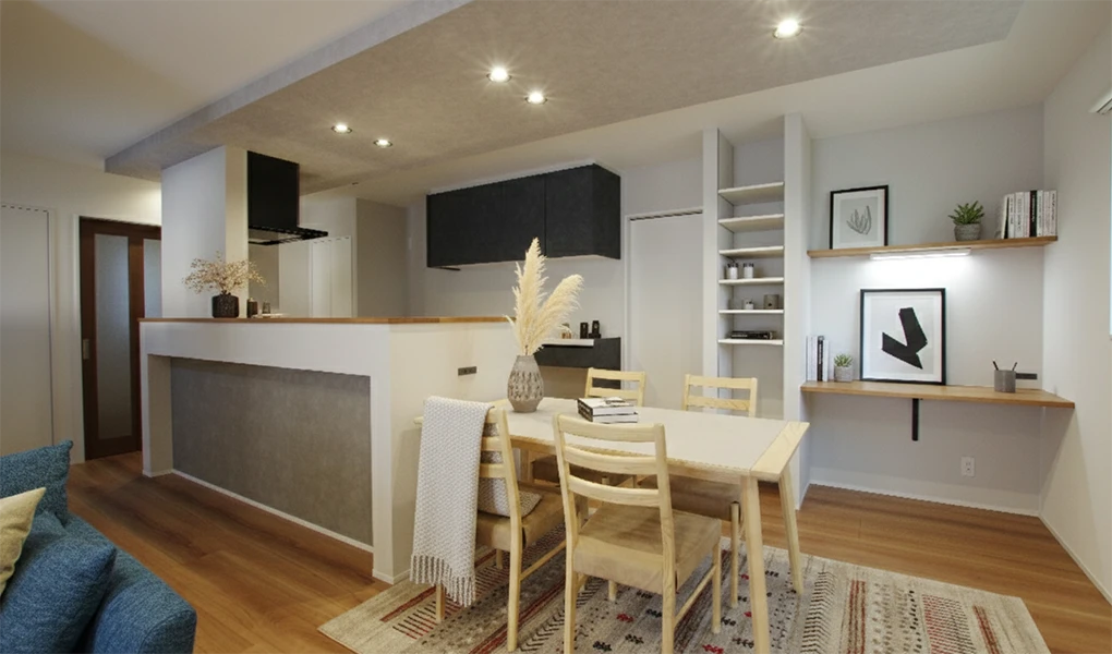 落ち着いたカラーの床材や建具、シックなキッチンを採用。ポイントにグレー系のアクセントクロスも取り入れつつ、暗い印象にならないようバランス良くカラーコーディネートしました。