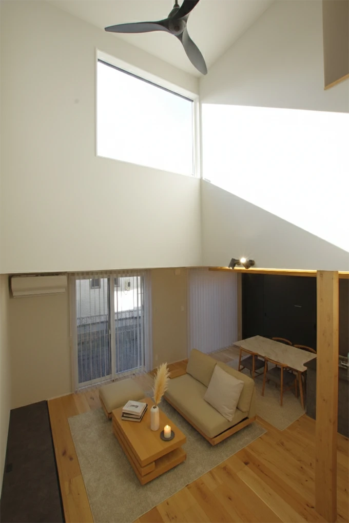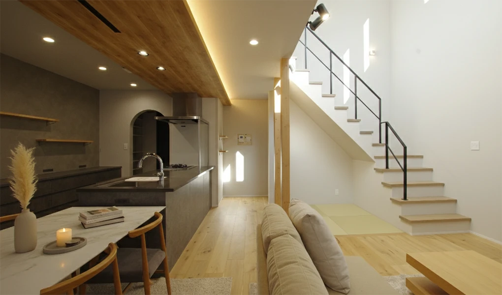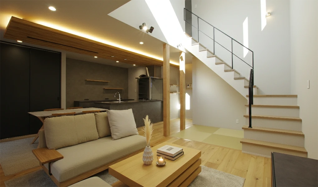 1階にはオークの挽板を採用し、足元から木の温もりに包まれます。吹き抜けに映える鉄骨階段の下には、心地よい畳スペースを設けました。厚みを抑えた折り下げ天井には間接照明を仕込み、落ち着いた雰囲気に。意匠性と開放感を両立した、ご家族が自然と集まる空間です。