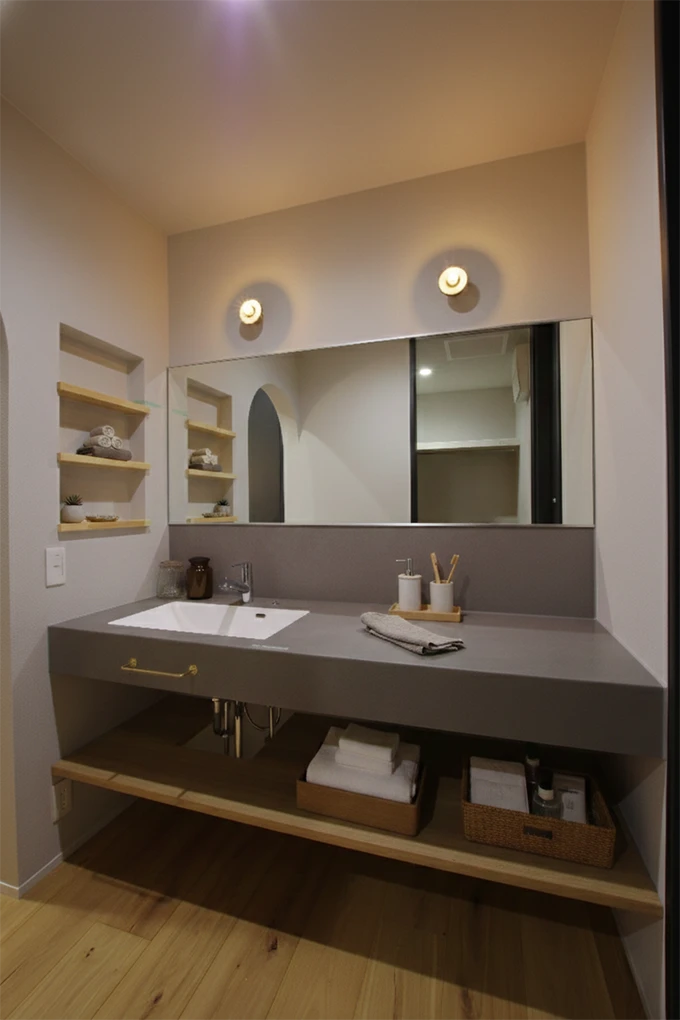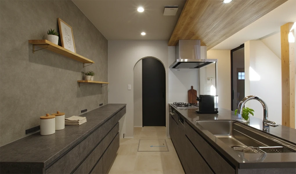 カタログや写真では伝わりきらない、素材の質感や計算された動線の利便性をぜひ現地でご体感ください。落ち着いたグレートーンの空間に、奥様のセンスが光る照明器具が調和する、上質な住まいの在り方をご提案いたします。
