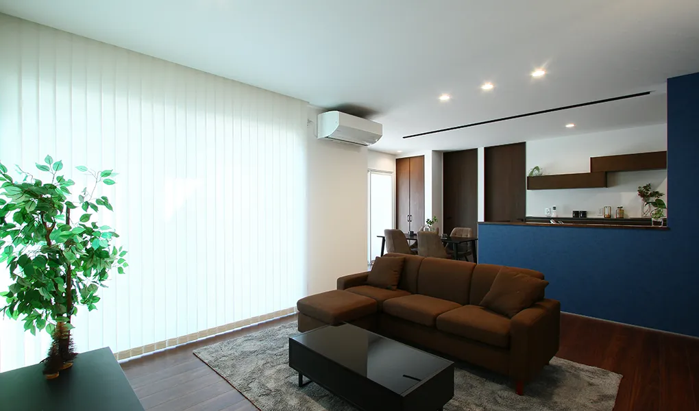 約100坪の敷地を活かし、平屋ながらも21帖超の開放的なLDKを実現しました。お施主様が大切にされたのは、今この瞬間の心地よさと、将来のライフステージの変化に柔軟に対応できる設計。お気に入りのブルーカラーをアクセントにしつつ、レトロな雰囲気も感じられるインテリアが、ご家族の豊かな毎日を支え続けます。