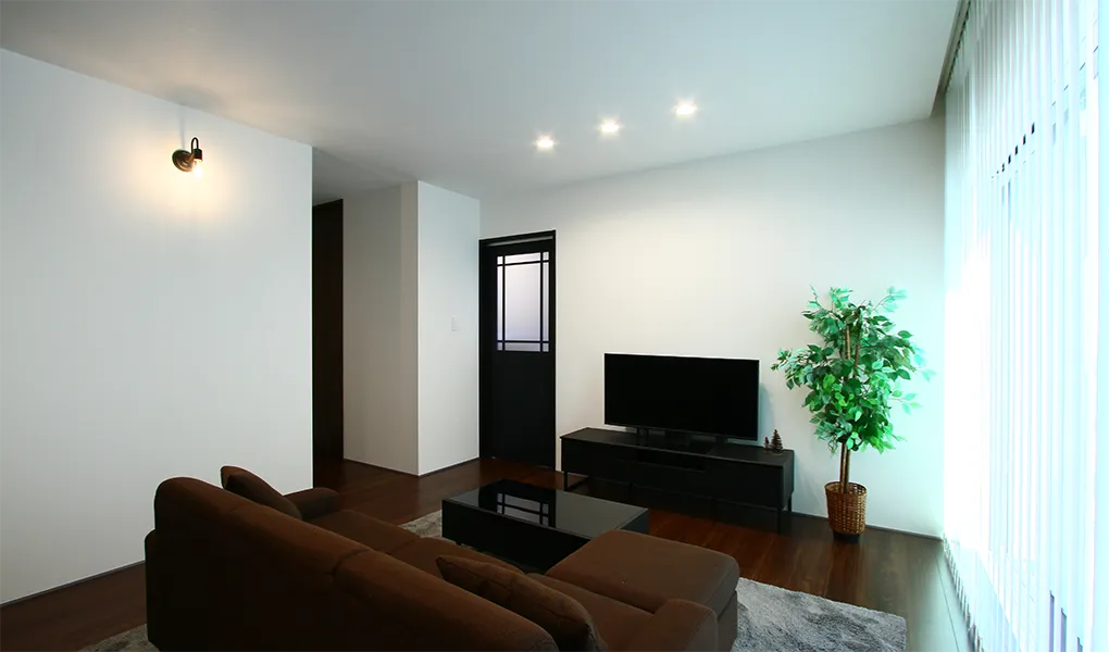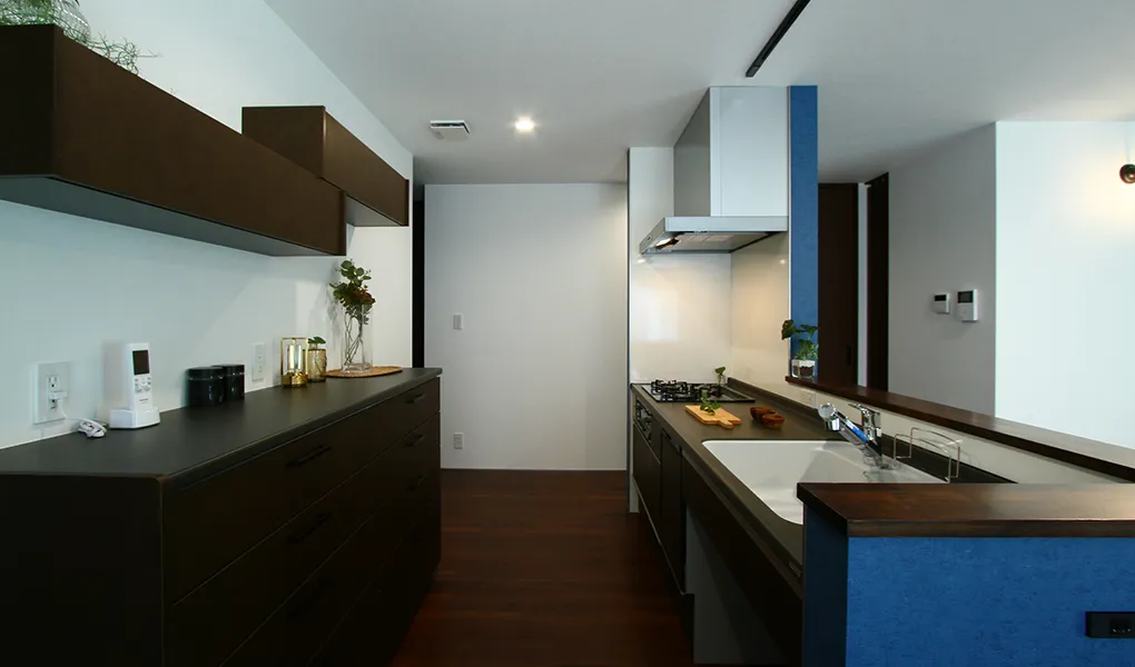 ダークブラウンの床にアクセントのネイビーが映えるインテリア。お施主様がこだわった格子ガラスデザインの引き戸や絵画を照らすためのブラケットライトが、空間に深みと趣を添えています。お気に入りの色とデザインに囲まれる、心安らぐ日常を演出しました。