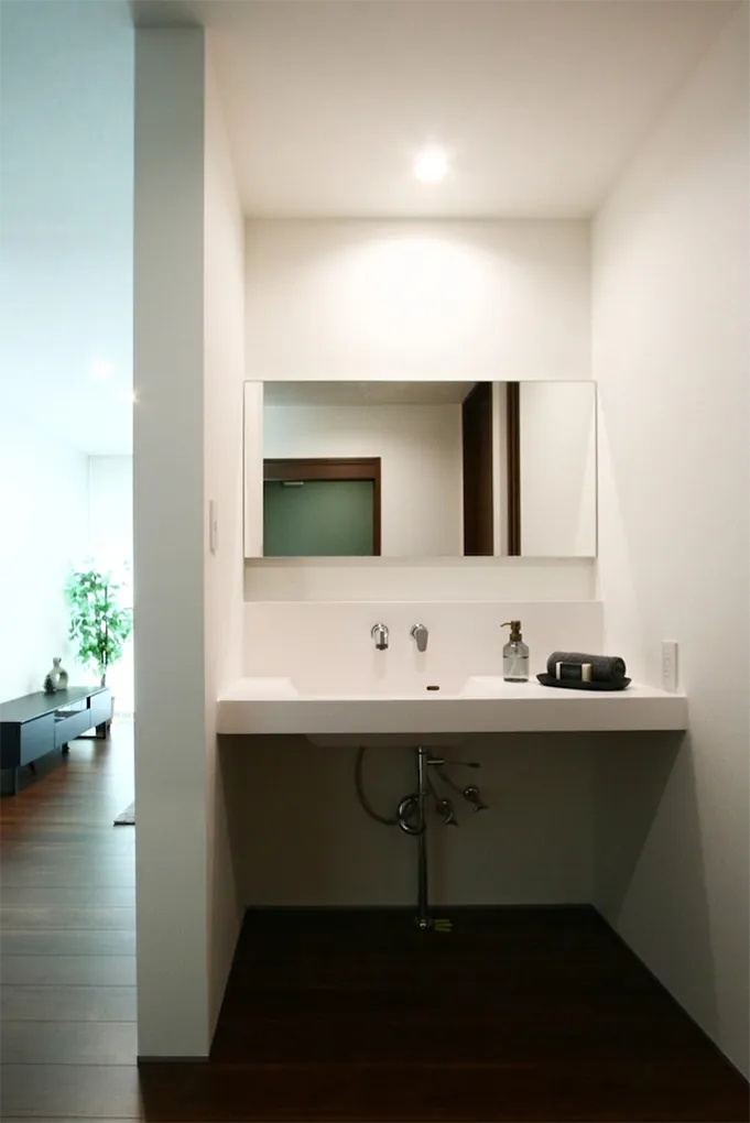玄関ホールにゆとりを持たせ、水回りまで直線で移動できる洋室も設けました。将来の暮らしやすさを想定した配置ながら、ご家族が自然と顔を合わせられる視界を保つことで、安心感を創出。優しさと機能性が共存する、世代を問わず永く住み継げる設計です。