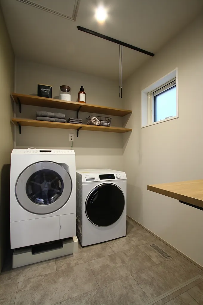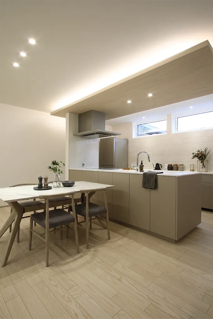 1階はトーンを抑えた落ち着きを、2階は光あふれる明るい空間を演出。リビングとキッチンの壁面に施したエコカラットや、計算し尽くされた間接照明の配置が、素材の質感と陰影を際立たせます。また、2階の造作洗面台には花模様のタイルやゴールドの意匠を凝らし、お施主様のこだわりを形にしました。