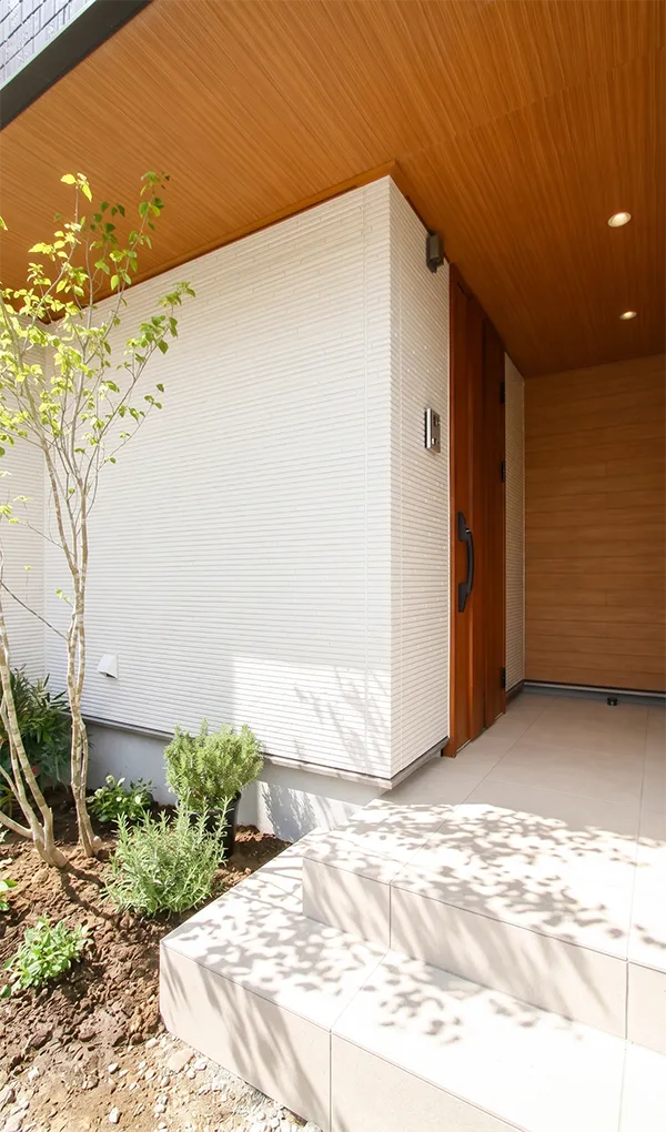 インナーガレージとメンテナンス性に優れた植栽計画が、外観に都市型邸宅らしい格式を添えています。インナーガレージは5.8mの大開口に、内部は最大幅7.2m以上のスペースを確保。タイヤなどを保管できる収納スペースや玄関クローク直結の動線も備えているため、快適でスマートな暮らしを支えます。