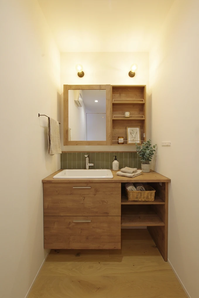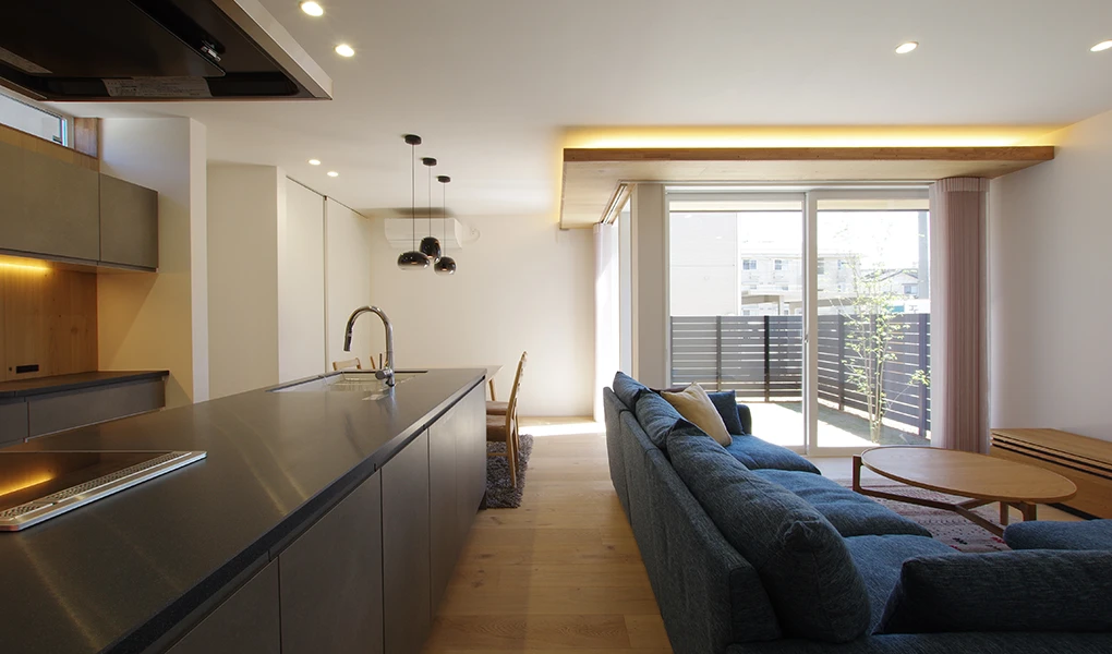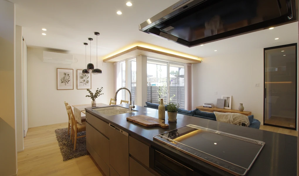 オープンキッチンを中心とした回遊動線は、ご家族のコミュニケーションを育み、毎日の家事を軽やかにします。キッチン収納背面には、床と同じ無垢材の突板を貼ることで空間の統一感を演出。間接照明に照らされる玄関のタイルなど、素材の質感にもこだわり抜きました。