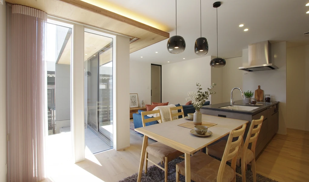 LDKの窓側に配した折り下げ天井には、床材と同じ突板(無垢材)を採用。さらにそのままタイルテラスの軒天へと繋げることで、視覚的な広がりを生み出しました。内から外へと自然に視線が抜ける、開放感に満ちた設計です。