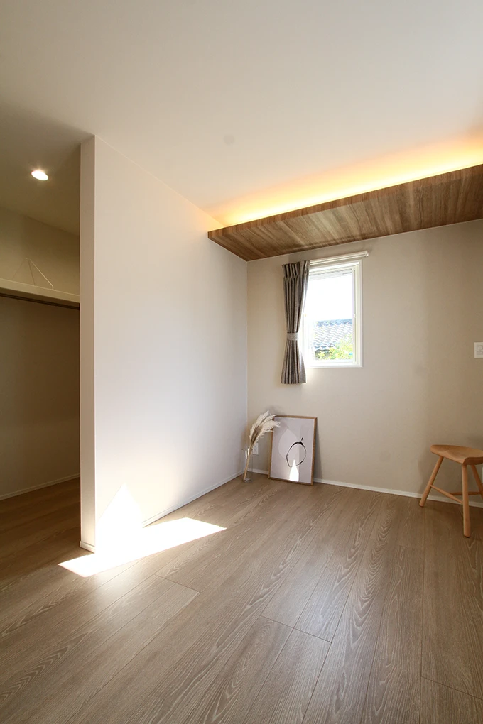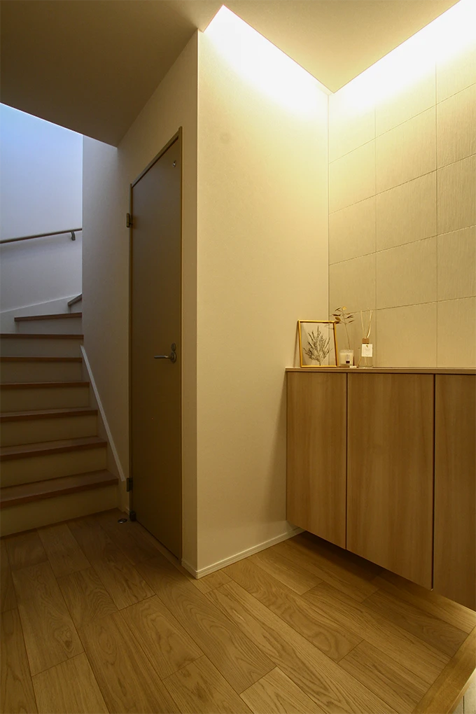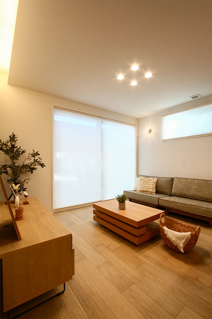 和モダンな柄のエコカラットやプリーツスクリーンを取り入れ、グレージュカラーでジャパンディテイストにまとめたインテリア。床材には木のぬくもりを感じられる突板を使用しています。