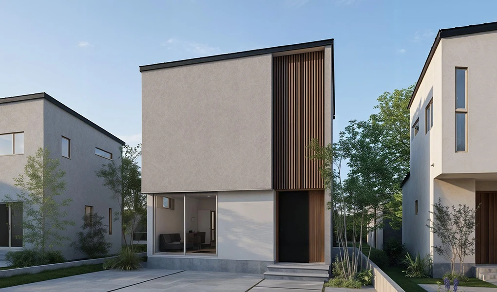 モデルハウス特別仕様として塗り壁をアクセント外壁に採用。さらに、コンテナガーデンでグリーンのある暮らしをご提案します。