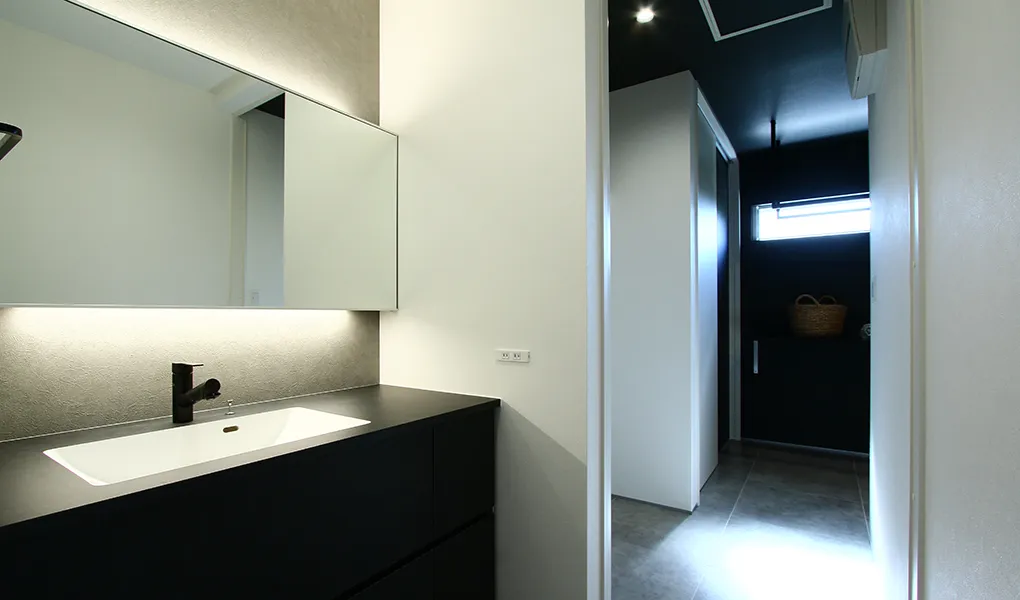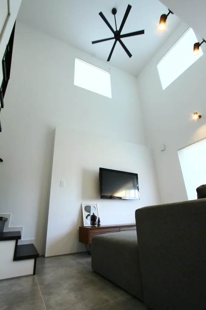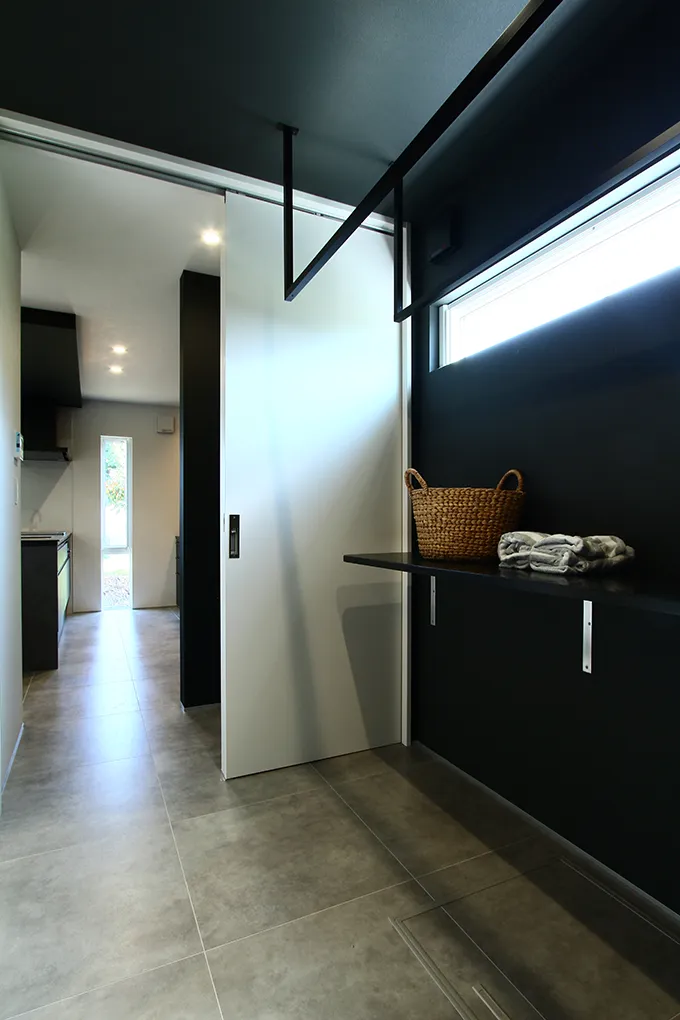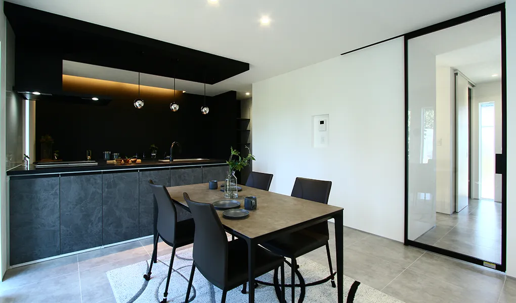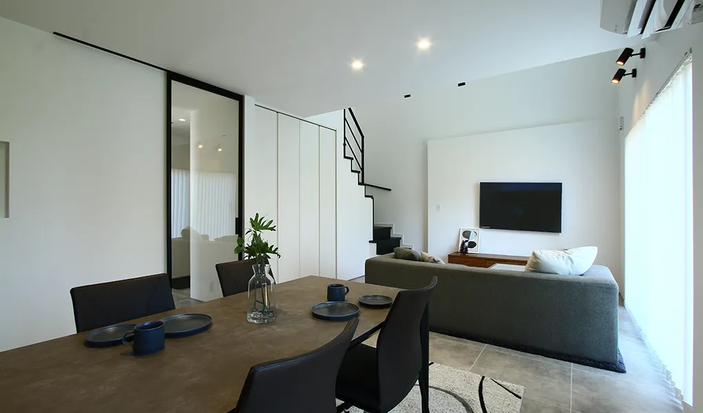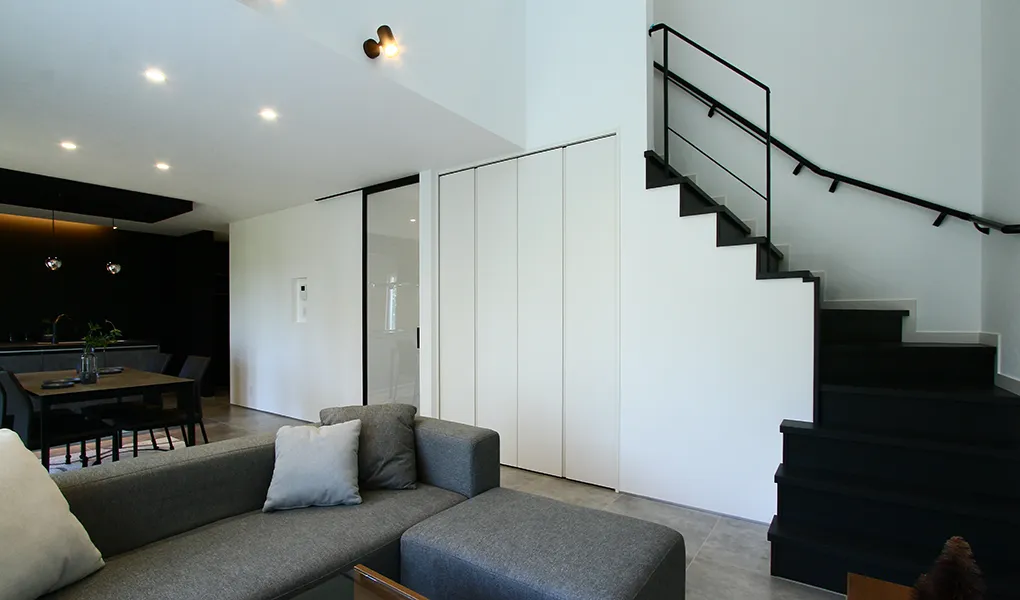 木目を使わず、白・黒・グレーでまとめたインテリア。1階は床材にモルタル柄のフロアタイルや、リビングの入口に全面採光のフルハイドアを採用してホテルライクに仕上げました。