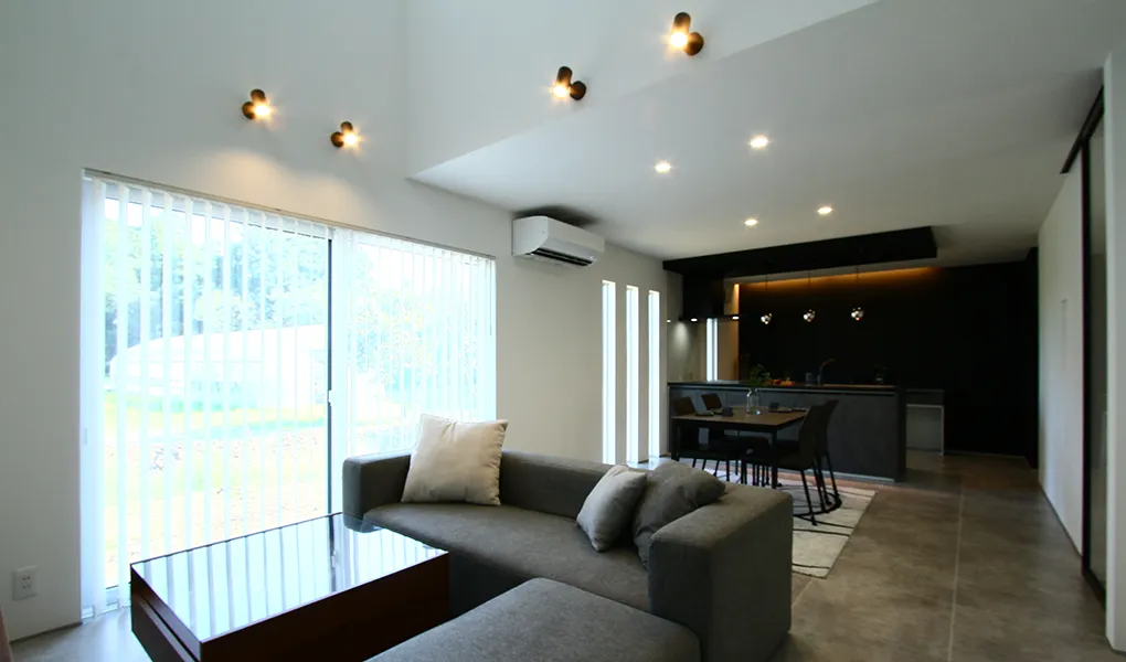 吹き抜けリビング×モノトーンインテリアで叶えたホテルライクな家(上越市四辻町)