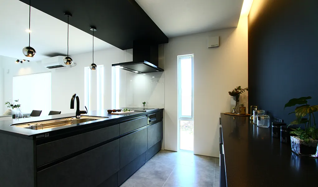 吹き抜けやフラットキッチンなど、空間を広く見せる工夫が随所に施されたストレート型LDK。1階は床材にモルタル柄のフロアタイルや、リビングの入口に全面採光のフルハイドアを採用してホテルライクに仕上げました。※外構はイメージ合成です。