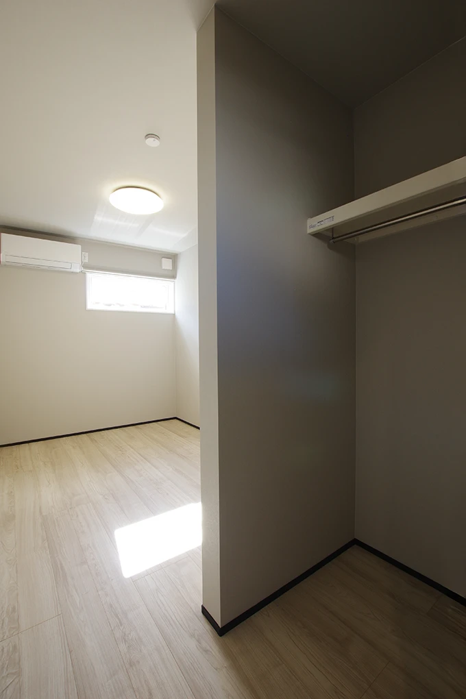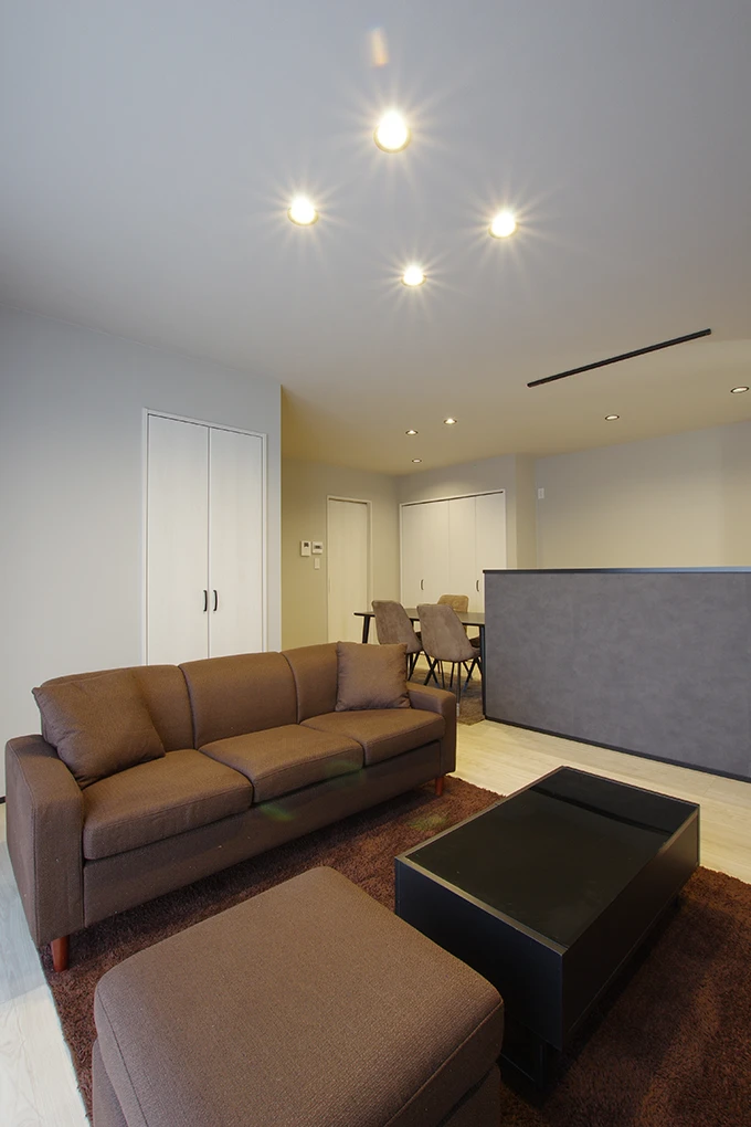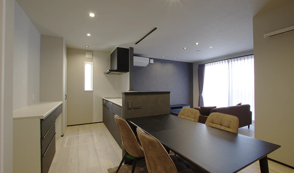壁と天井はグレーを基調とし、アクセントにブラック系のクロスを取り入れたコーディネート。ダウンライトと巾木もブラックに統一しています。
