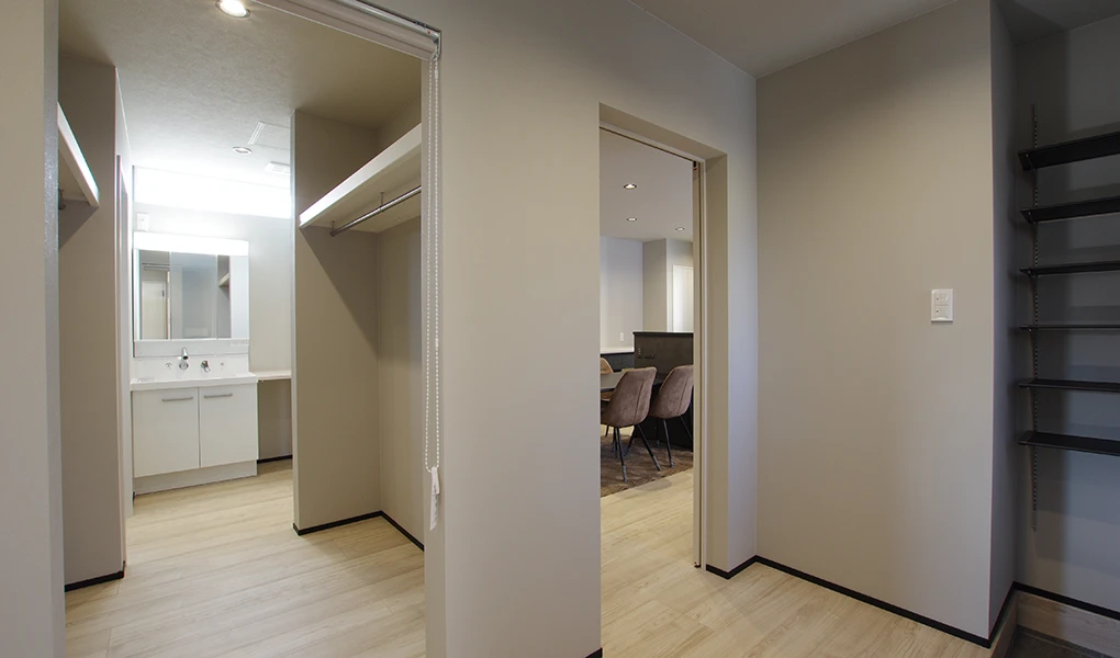 LDKを通らずに、玄関からファミリークロークや洗面室へ直行できる便利な回遊動線になっています。