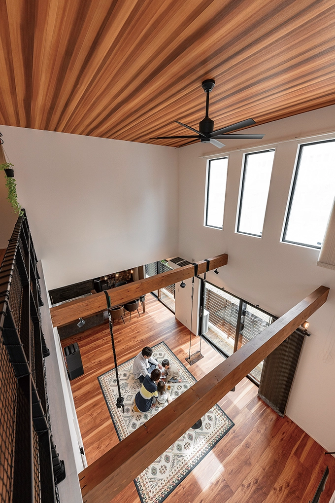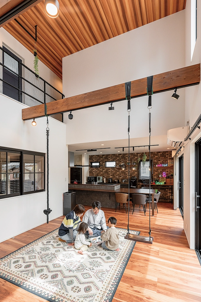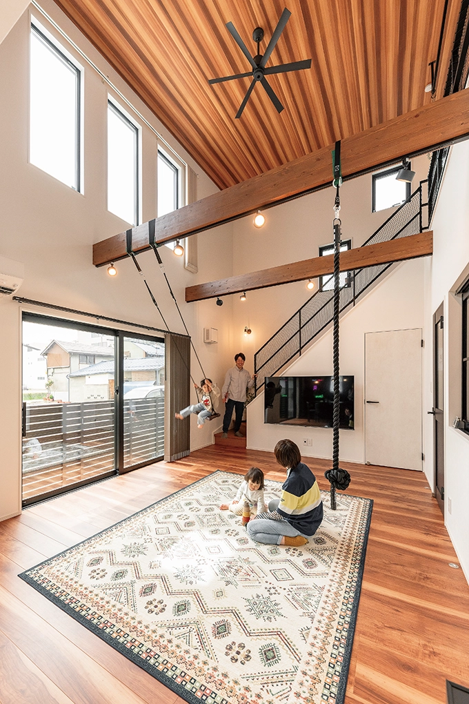 梁を活かしたブランコやクライミングロープ、走り回れるリビングは、ご家族で楽しむ暮らしそのもの。