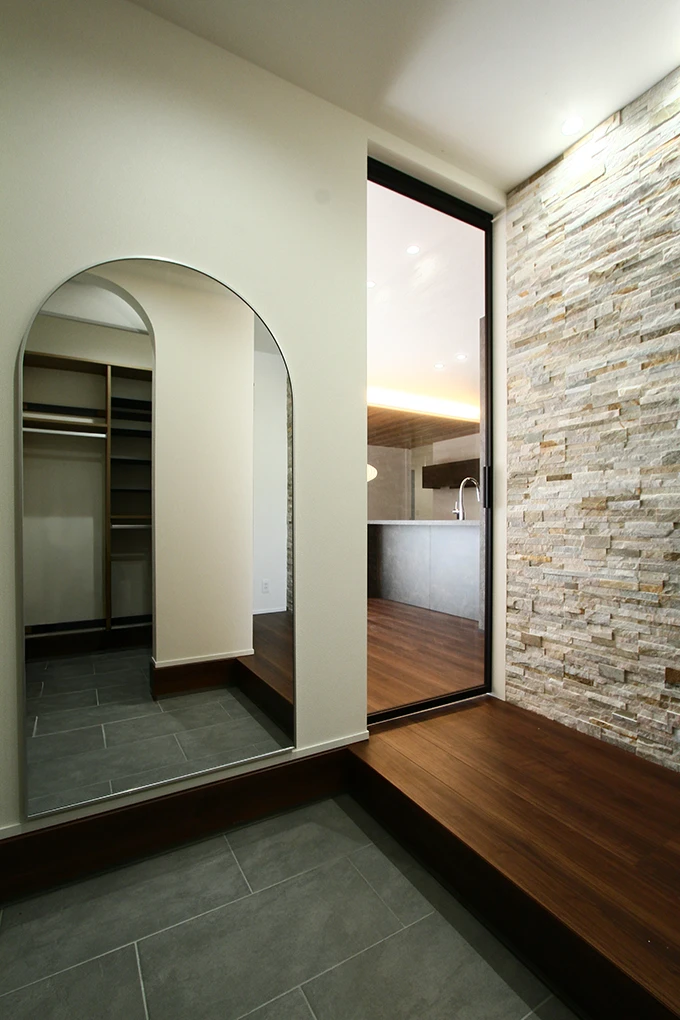 ガラスのハイドアで視線が抜け、大きな鏡で空間が広く見える玄関。